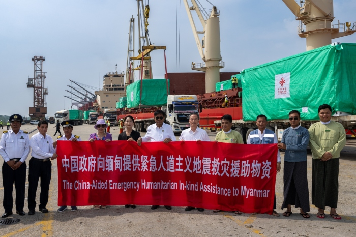 5月9日,中国政府援缅第十三批紧急人道主义地震救灾物资——1576套住宅板房及配套家具运抵仰光迪洛瓦港口。10日上午,中国驻缅甸使馆欧阳道冰参赞、仰光省自然资源部长佐温在港口进行了交接。