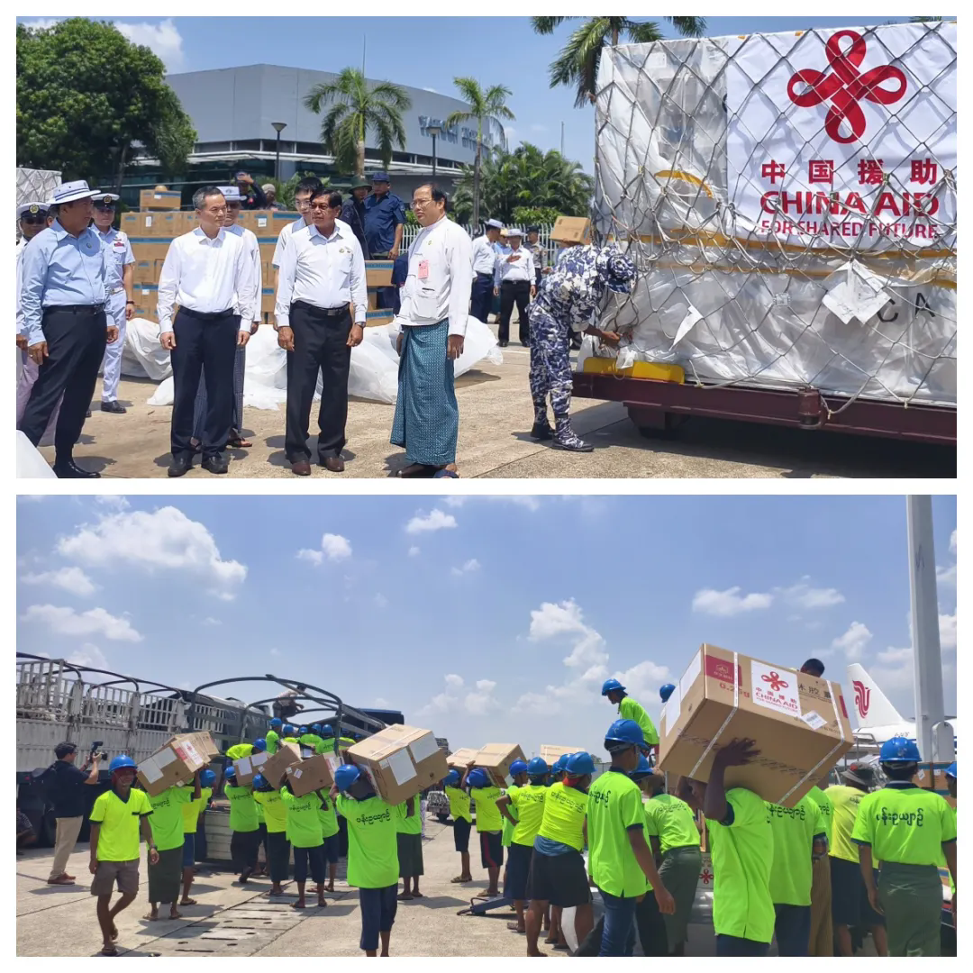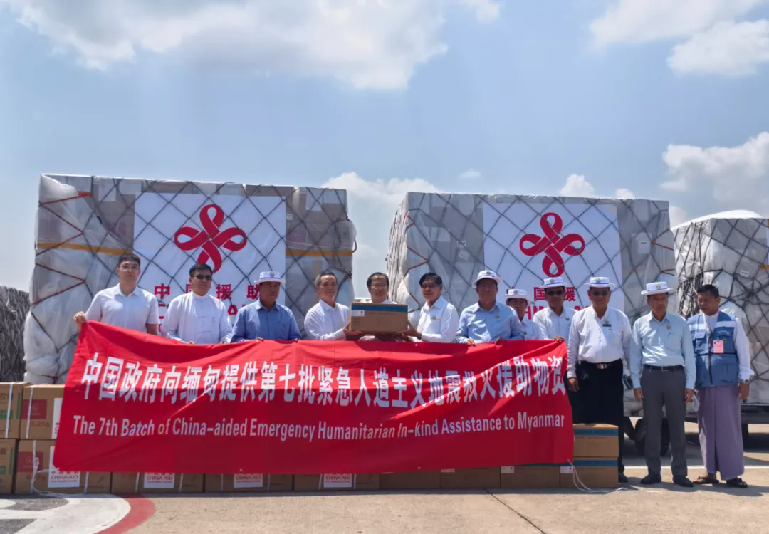 当地时间4月20日12点30分,中国政府向缅甸提供的第七批紧急人道主义地震救灾物资运抵仰光国际机场。中国驻缅甸使馆欧阳道冰参赞、仰光省首席部长梭登赴机场迎接。