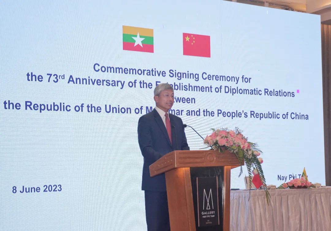 6月8日中缅建交73周年之际,中国驻缅甸大使陈海在内比都出席澜湄合作专项基金2023年缅方项目、中国援缅新一批300万剂新冠疫苗、援缅现代化培训实验室物资项目、援缅昂山体育场重建项目可研等中缅合作文件签署和交换仪式。缅甸外交部、卫生部、科技部、体育与青年事务部等10个联邦部委部长或高级代表出席。